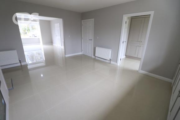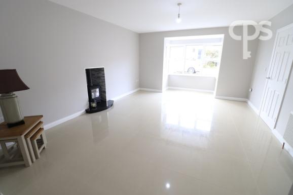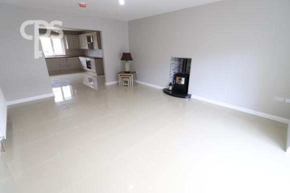 Large living room with front aspect. The room offers open planned access to kitchen area and a fitted multi-fuel stove. Ceramic tiled flooring with a bay window.