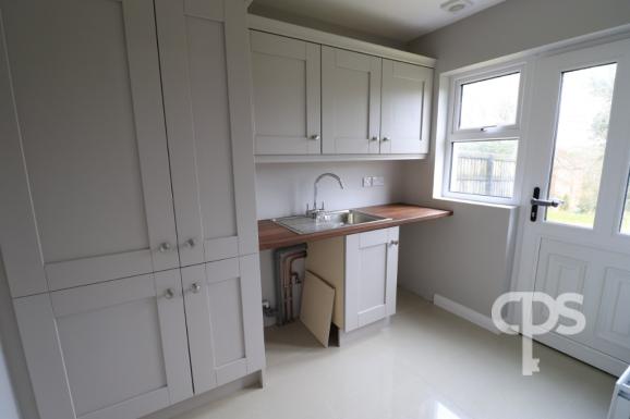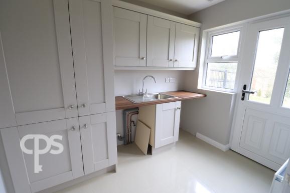 Fitted units with stainless steel sink. Plumbed for washing machine and tumble dryer. Access to guest WC and ceramic tiled flooring.